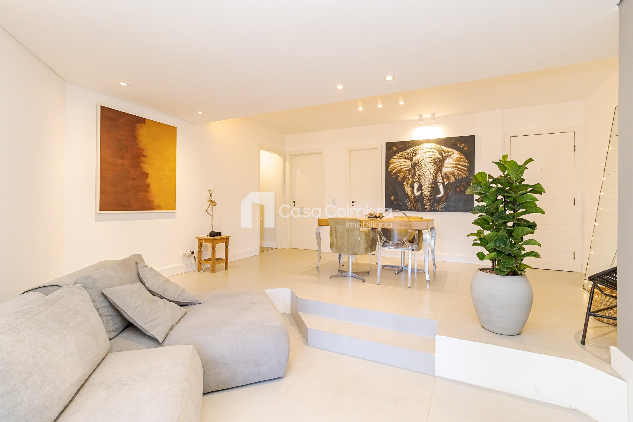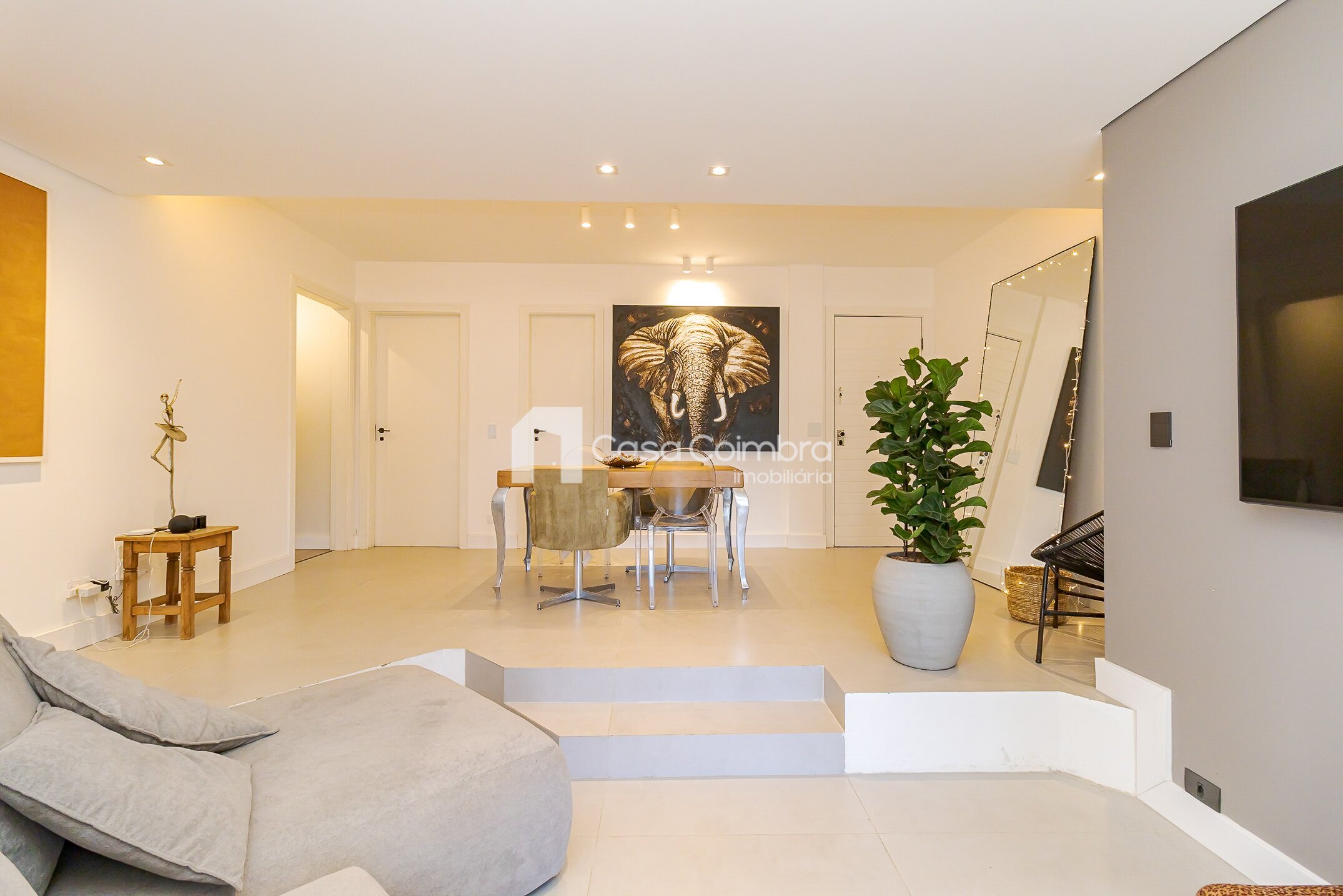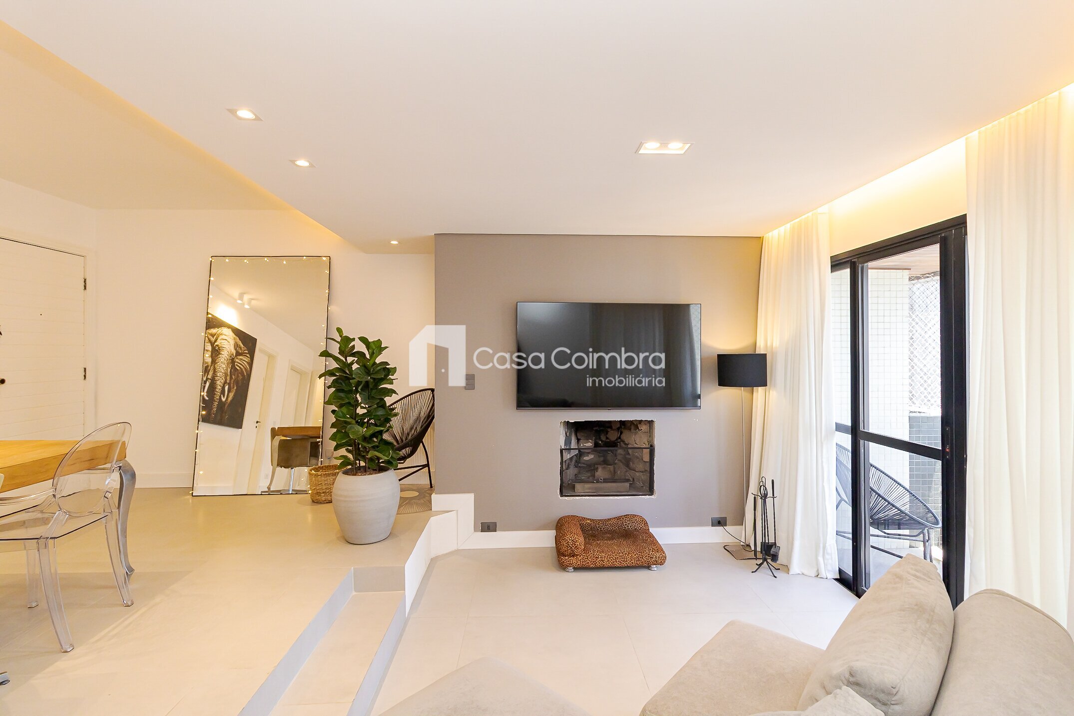 - Sala ampla em dois ambientes, com desnível que delimita de forma charmosa a área de estar e jantar, além de lareira e lavabo