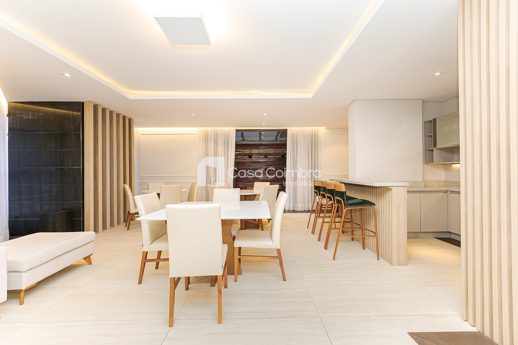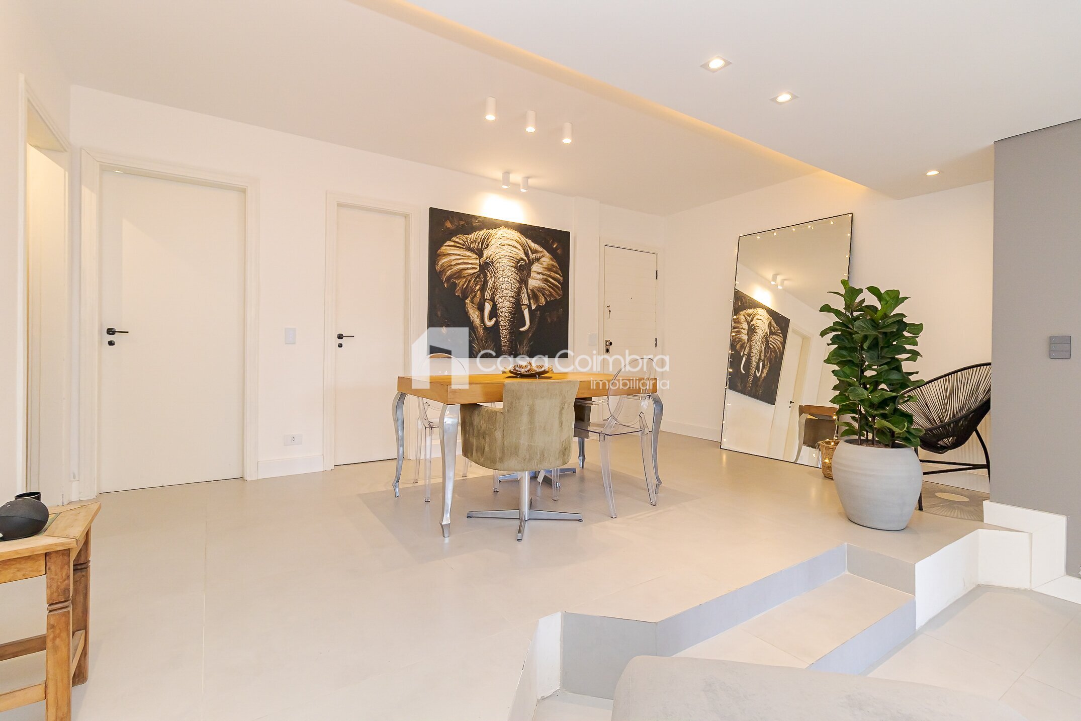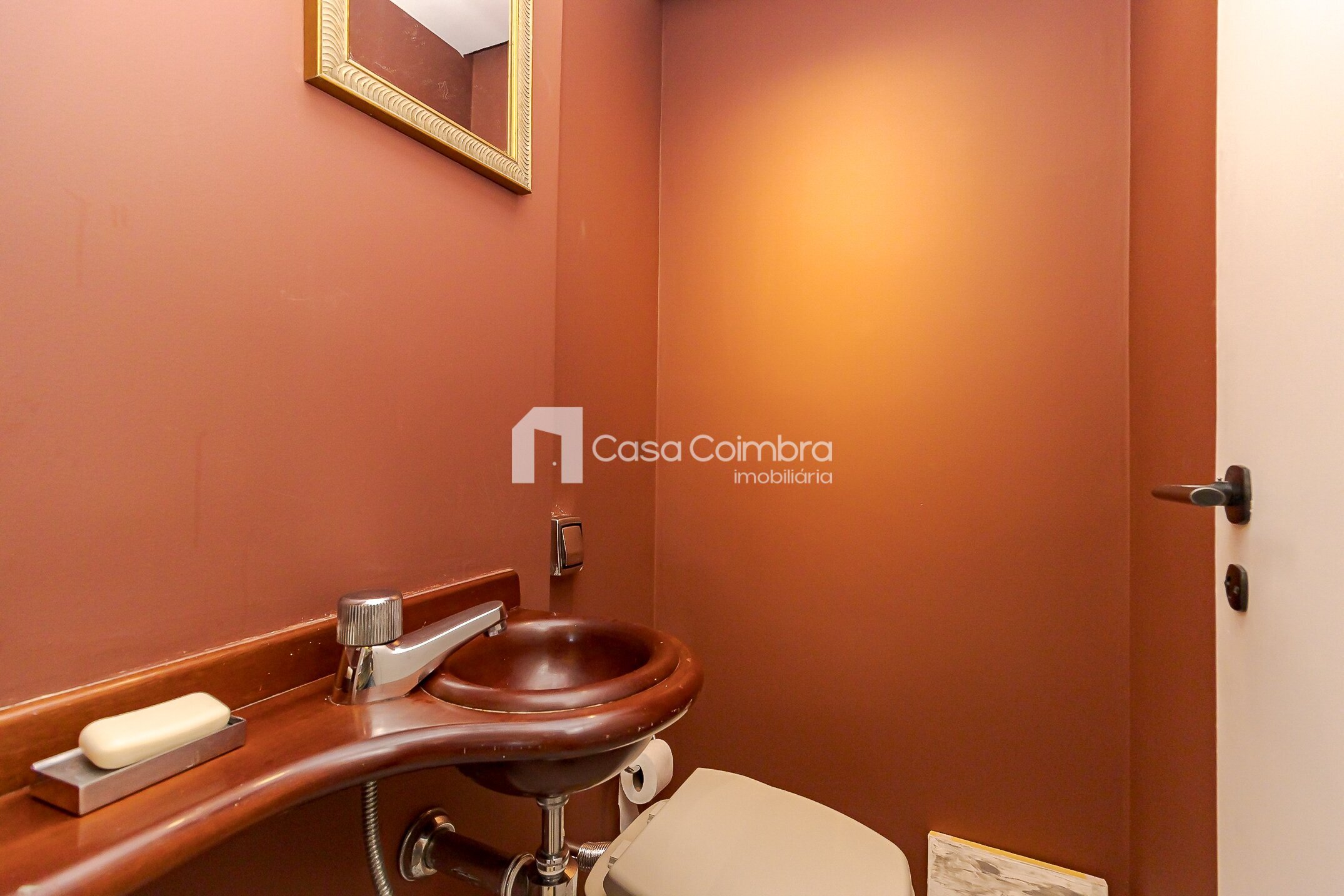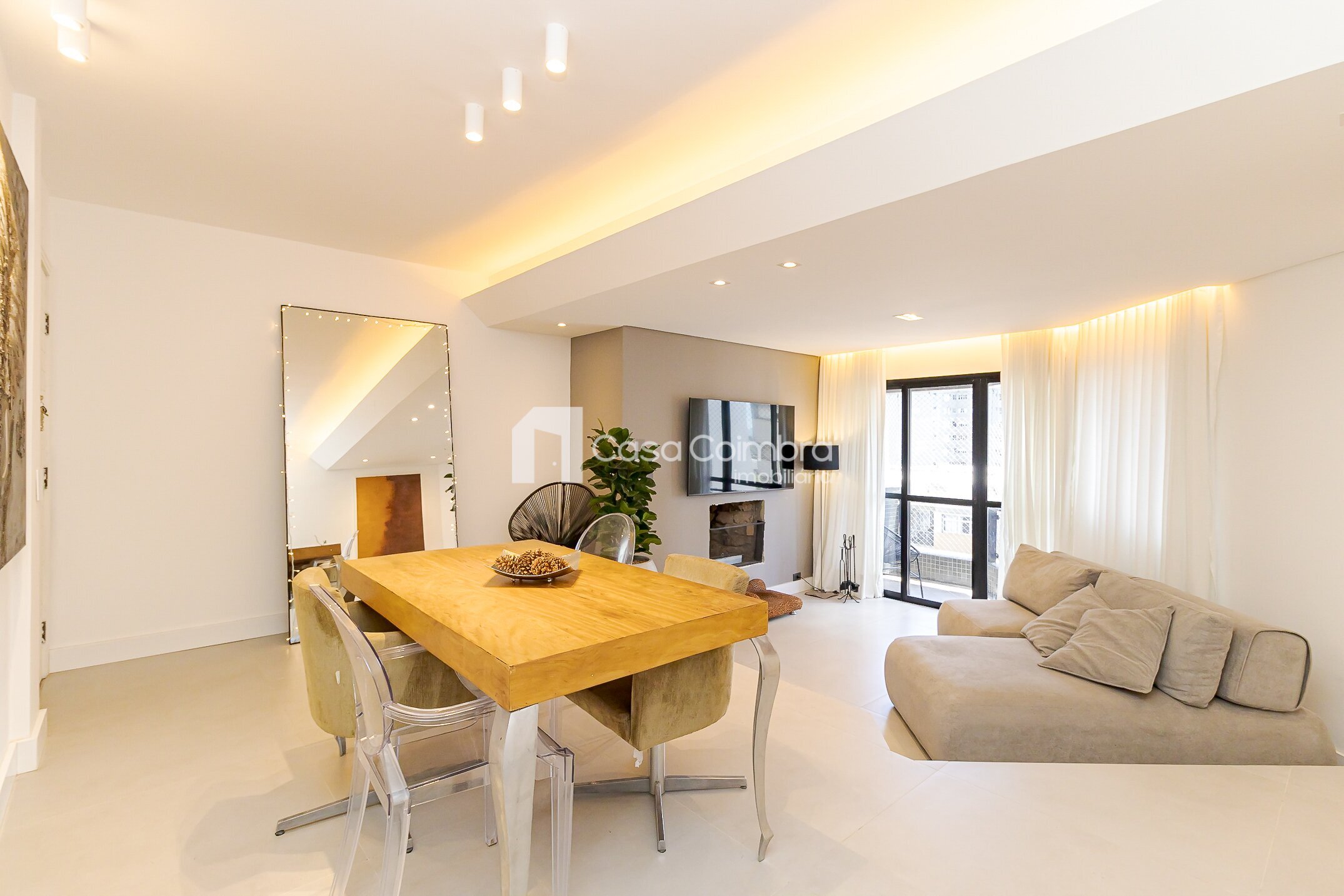- Sala ampla em dois ambientes, com desnível que delimita de forma charmosa a área de estar e jantar, além de lareira e lavabo