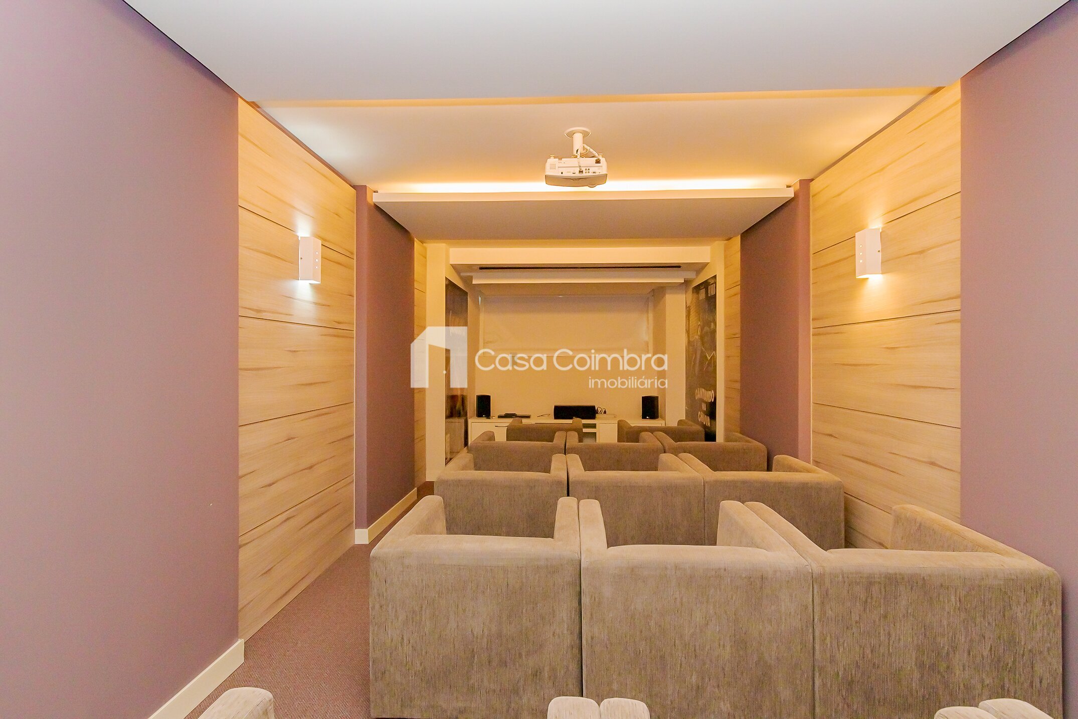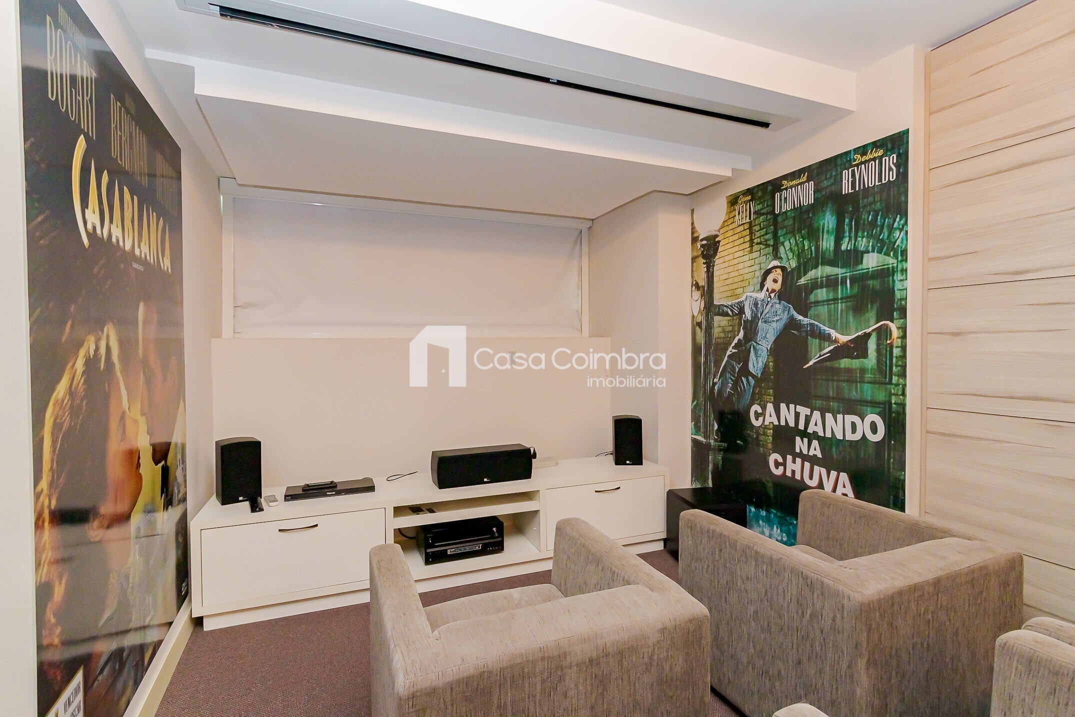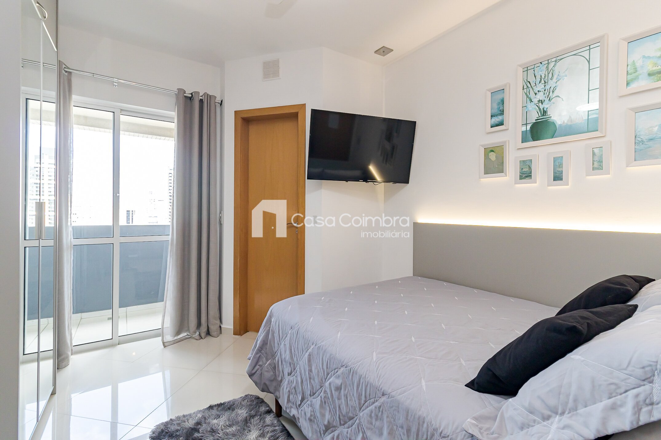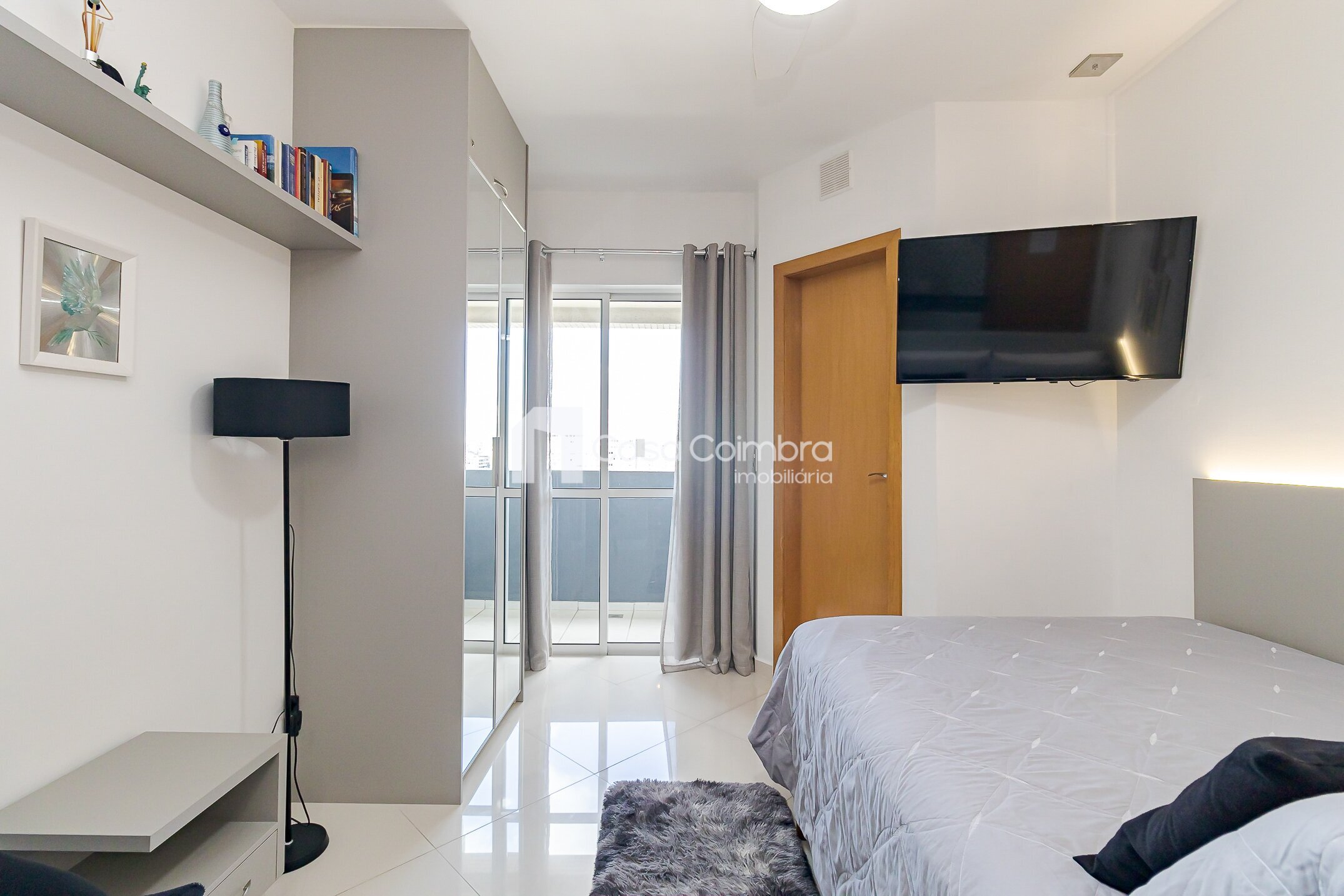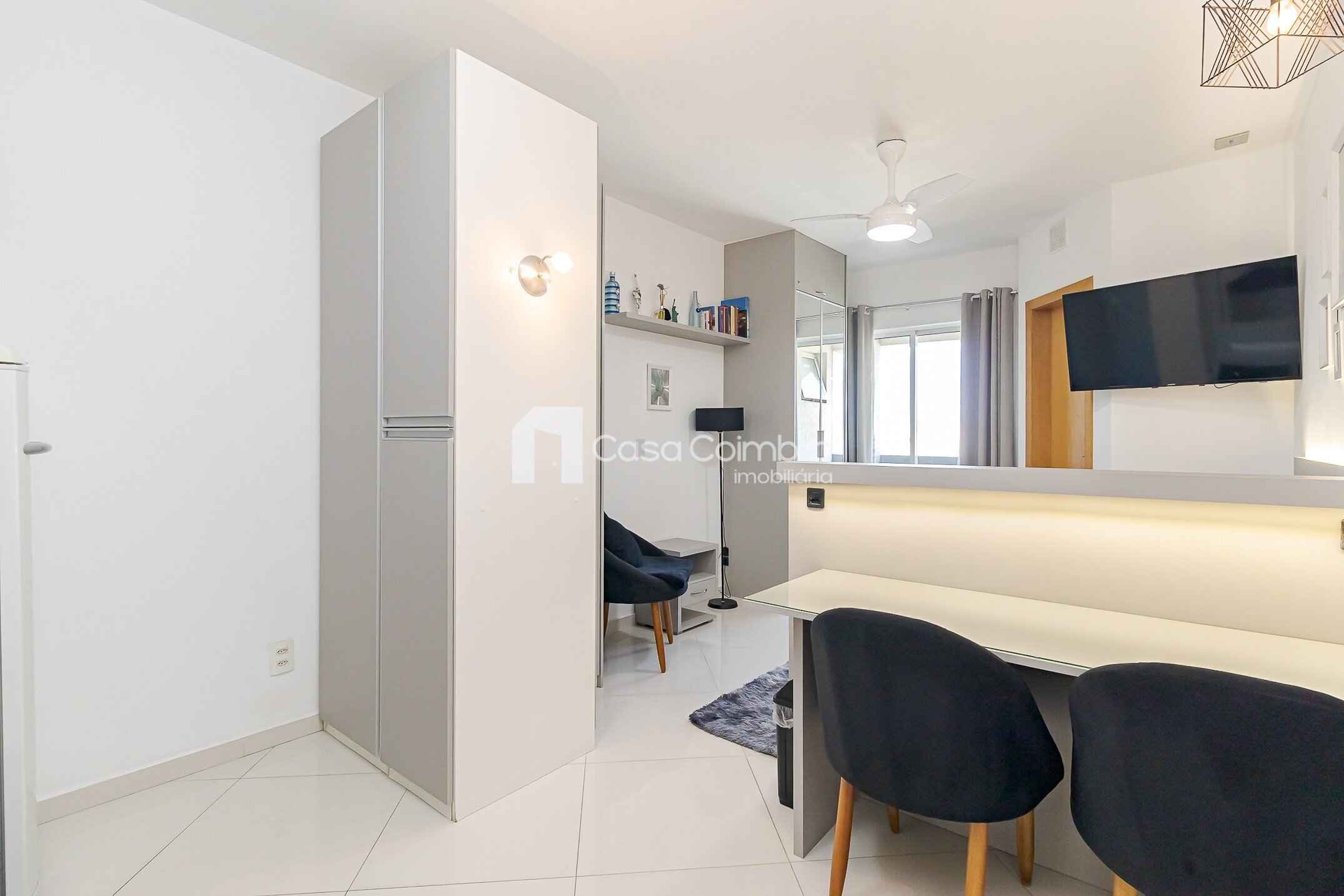 • Quarto com armários planejados, cama box, TV, bancada com banquetas e poltrona