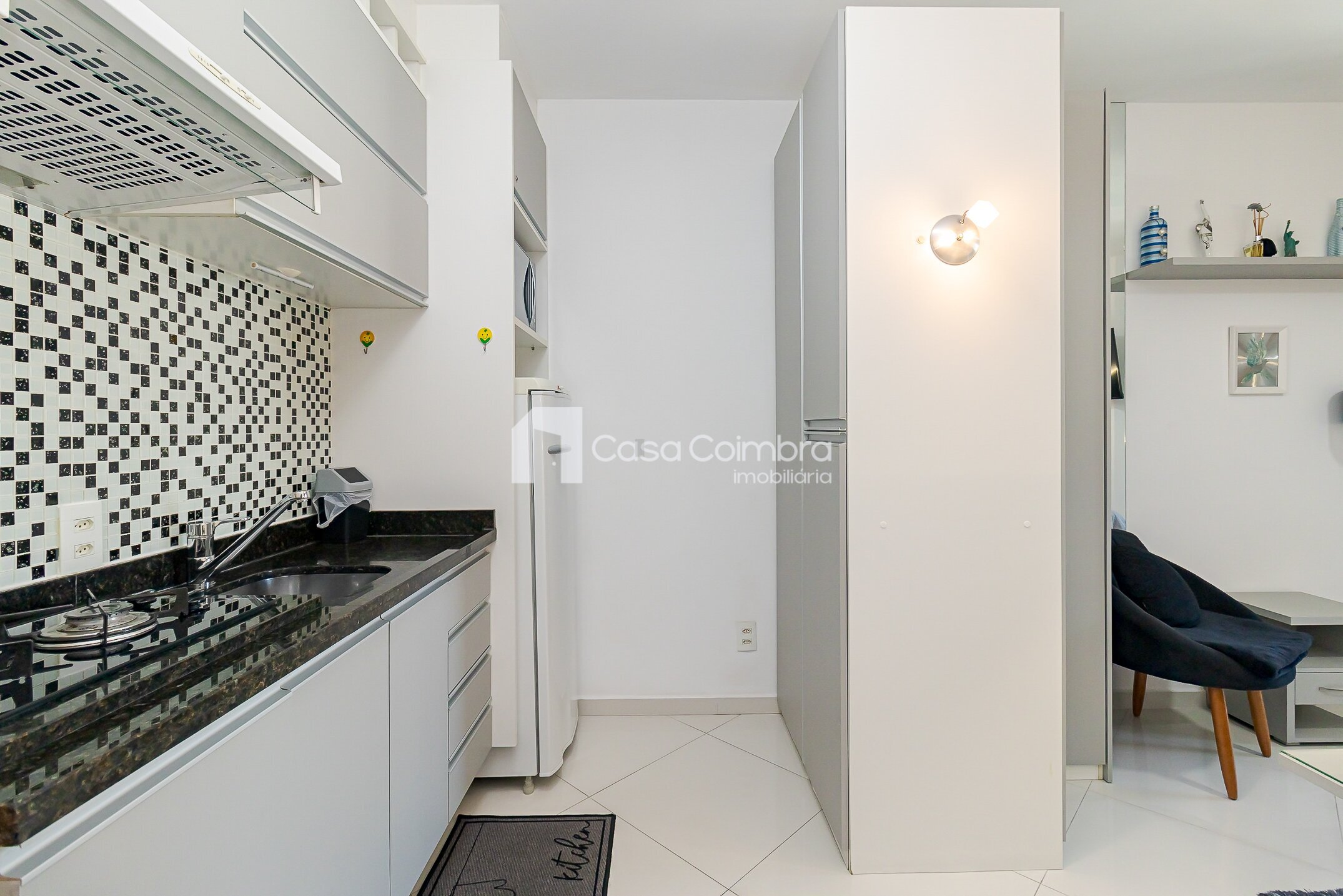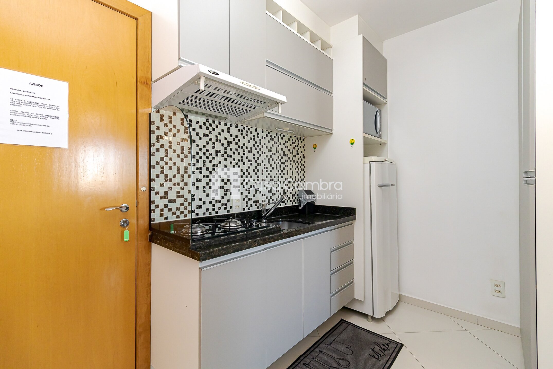 • Cozinha equipada com armários planejados, tampo em granito, geladeira, cooktop e micro-ondas