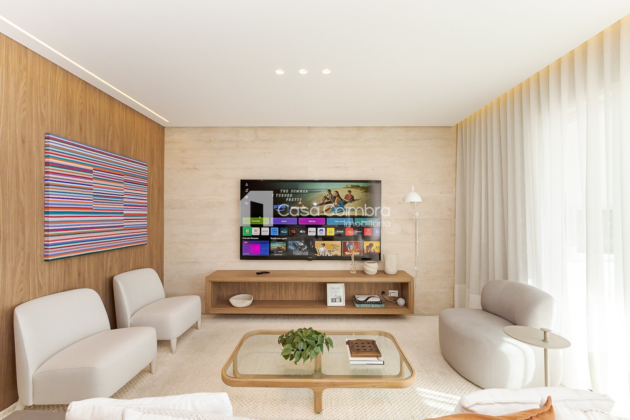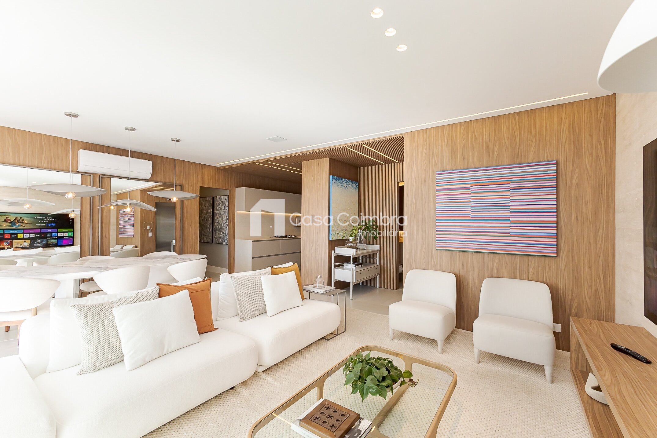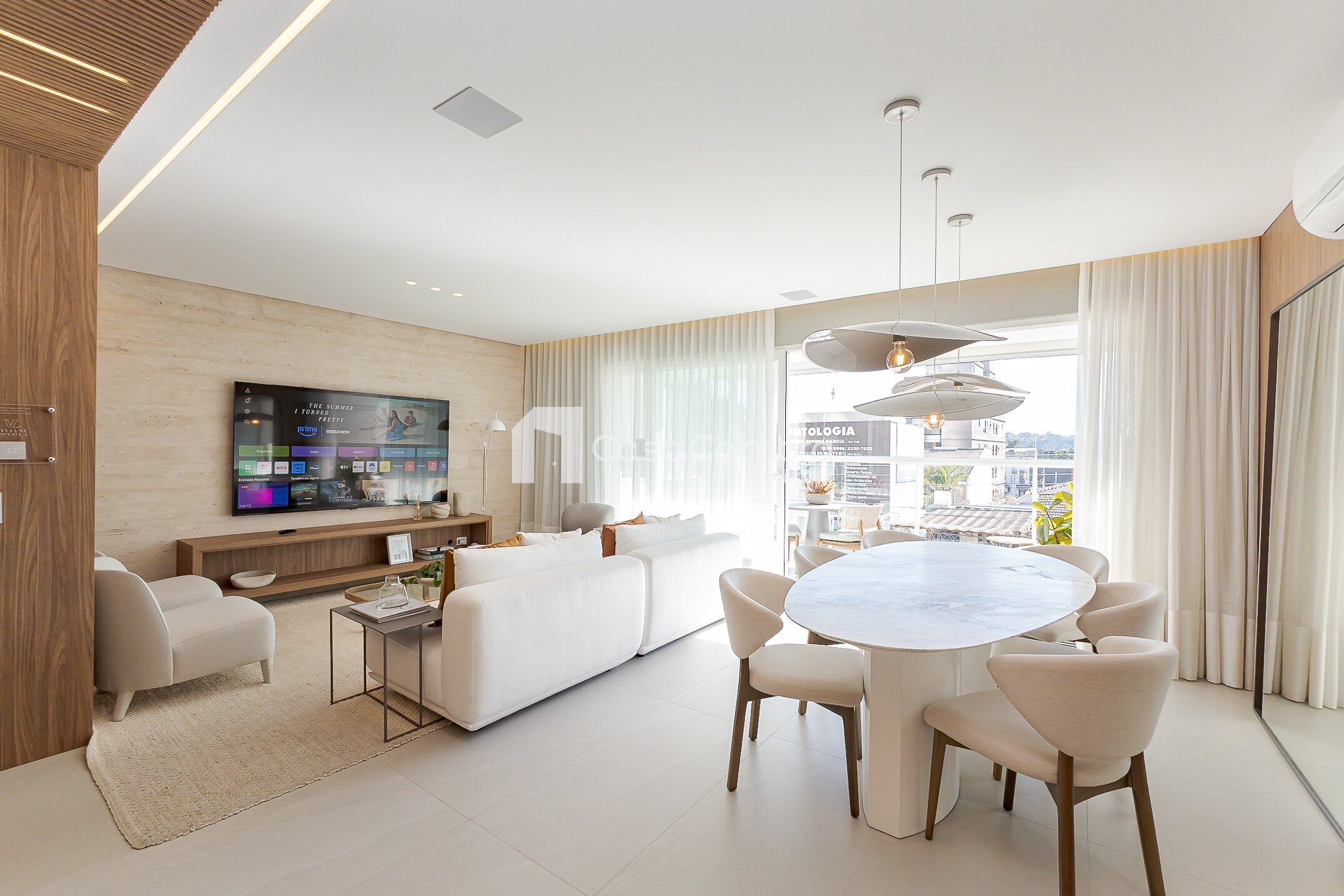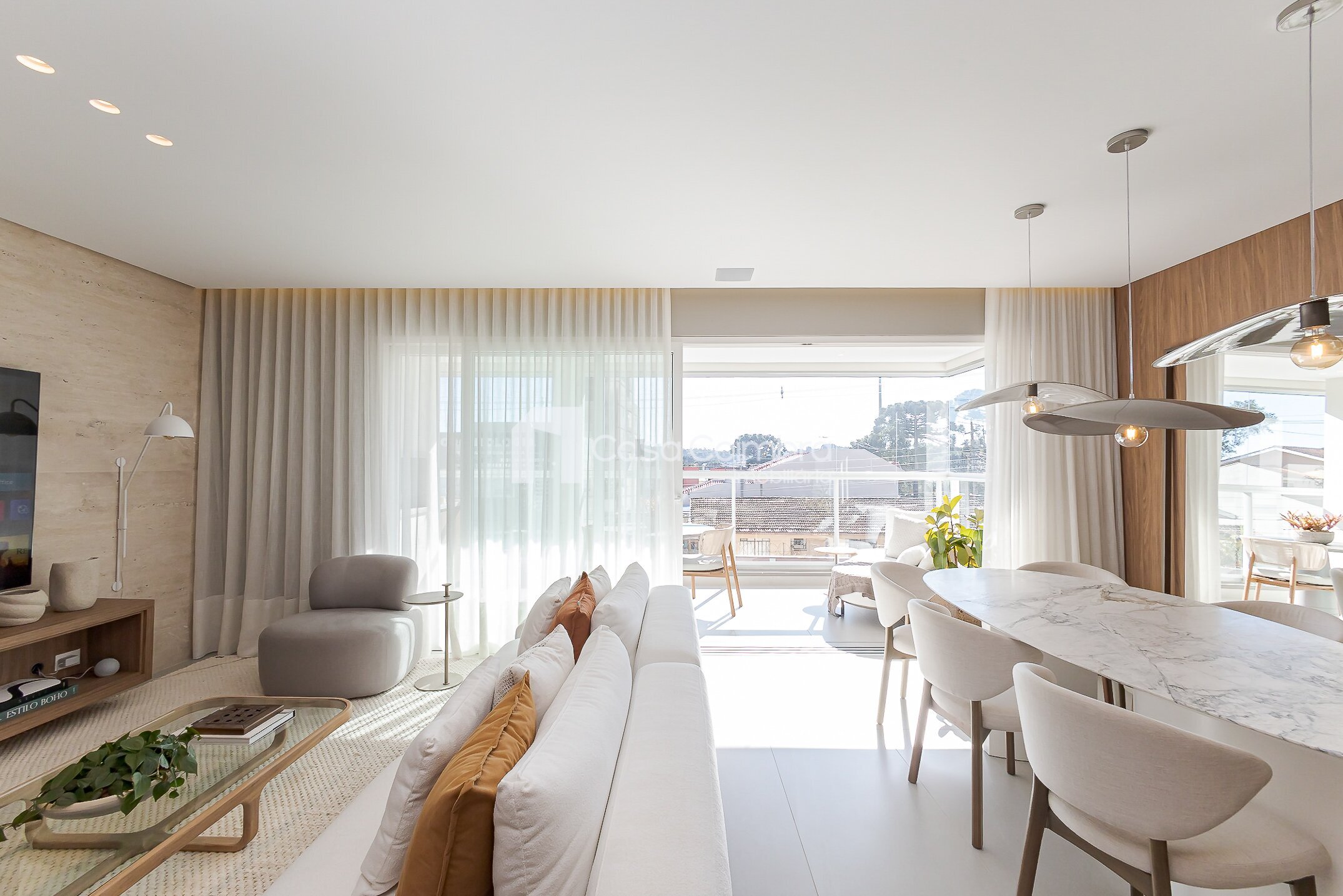 - Sala de estar ampla, com ambientes integrados e iluminação natural.
